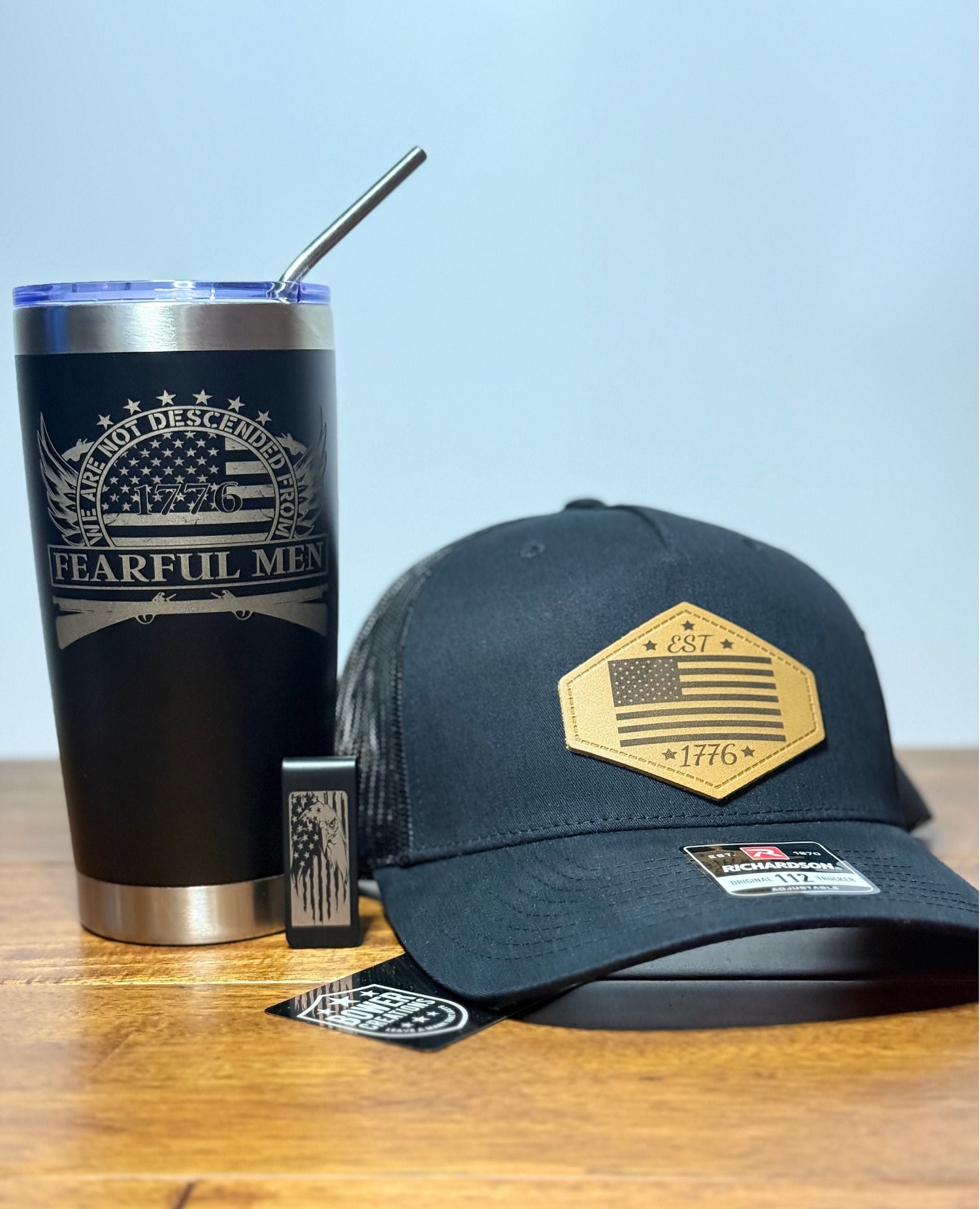 The American Legacy Set includes the 1776 hat, stainless tumbler, flask, money clip, and keychain. Each piece represents craftsmanship and the pride of doing things right. Built for those who carry their values in their hands and their legacy in their work.
